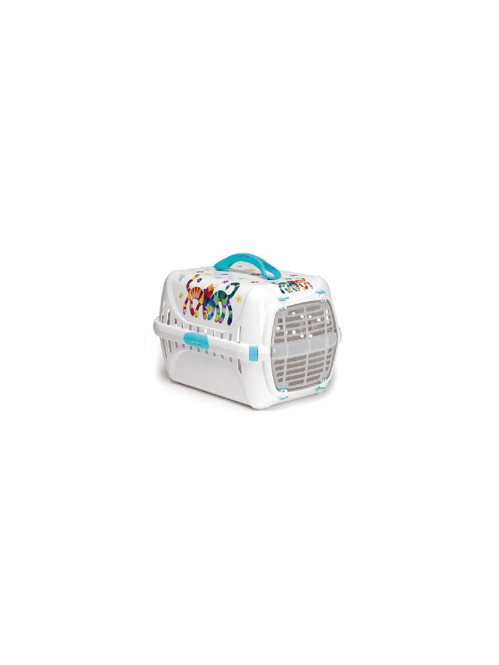 Il coperchio del trasportino è situato nella parte inferiore, fissato mediante chiusure di sicurezza a clip. Nella parte superiore è presente la maniglia e un apertura che vi consentirà di poter inserire la mano senza il pericolo che il vostro gatto possa sgattaiolare fuori. Per garantire un aereazione ottimale, sono presenti degli appositi fori di ventilazione traspiranti. Il trasportino è disponibile nell’unico formato standard (vedi immagine) bianco con porta e coperchio grigio, quest’ultimo con disegni di gattini e scritte in tema.