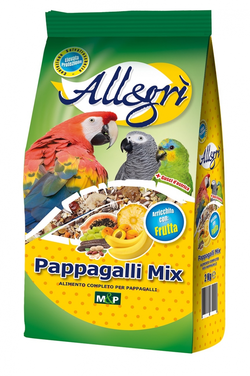 PAPPAGALLI MIX ALLEGRI’ da kg. 2 Alimento completo per pappagalli, è un mix caratterizzato non solo da un importante contenuto di frutta ed ortaggi ma anche da una grande varietà di materie prime. Contiene inoltre gusci d’ostrica triturati.