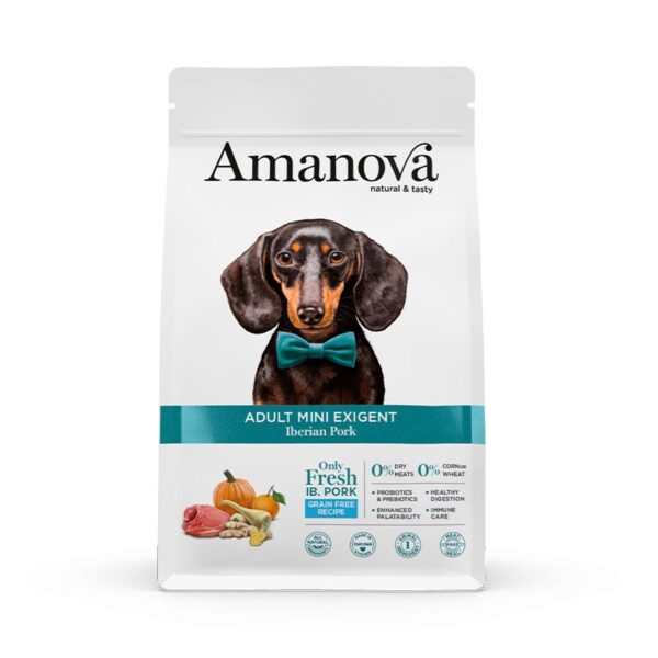 Maiale iberico fresco 52%, patata, piselli, mela, olio di pollo, zucca, idrolizzato di fegato di maiale , lieviti, proteina di patate, pastinaca 1%, sostanze minerali, arancia 0,50%, olio di pesce, zenzero 0,10%, glucosamina, inulina (FOS) 0,10%, mannano-oligosaccaridi (MOS) 0,10%, Yucca schidigera, solfato di condroitina.