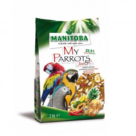 My Parrots Ara della Manitoba è un alimento estruso per pappagalli di grande taglia come ad esempio le Are e Cenerini, realizzato a base di estrusi vegetali con frutta secca e frutta disidratata.
